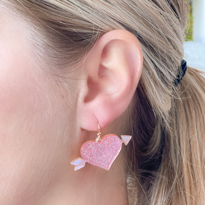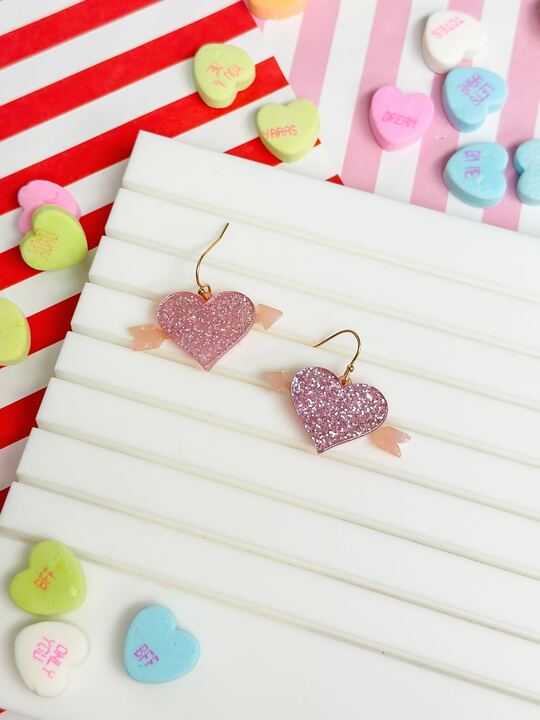 Add a touch of sparkle and whimsy to any outfit with our Acrylic Glitter Bow & Arrow Heart Dangle Earrings.