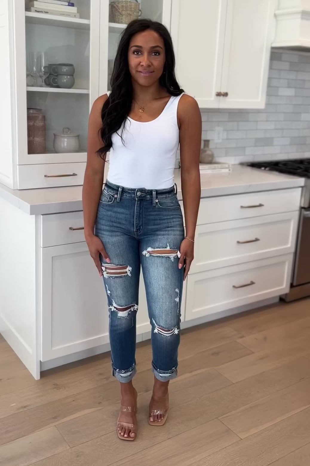 Show off your style and comfort with these Belinda High Rise Distressed Straight Jeans. Featuring a high-rise fit, distressed details, and optional rolled cuffs, they make an effortlessly cool statement. You'll love their timeless look and easy-to-wear comfort.