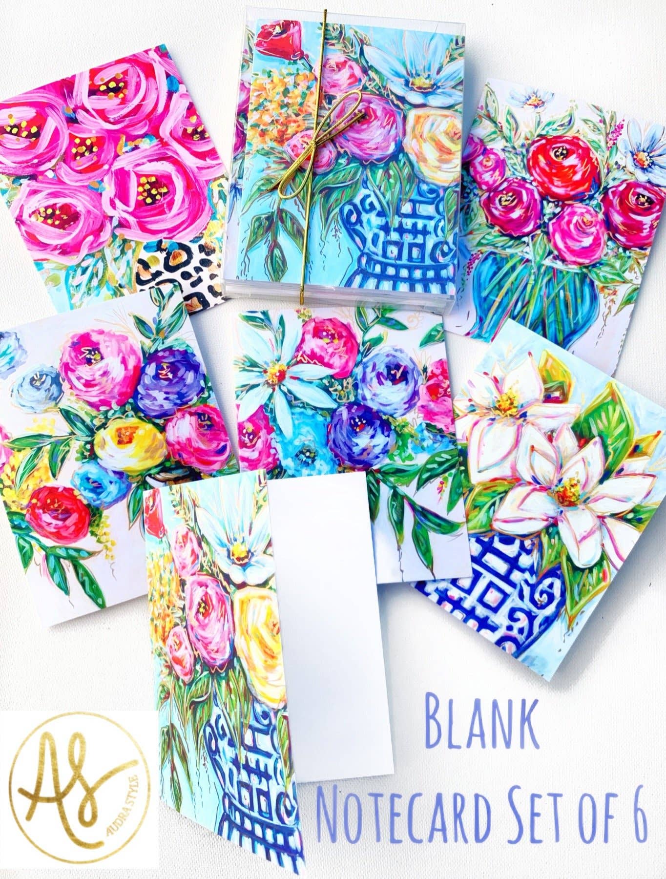 Notecard set of 6 designed from Audra’s original bouquet paintings. Blank inside and comes in a clear plastic box with white envelopes.