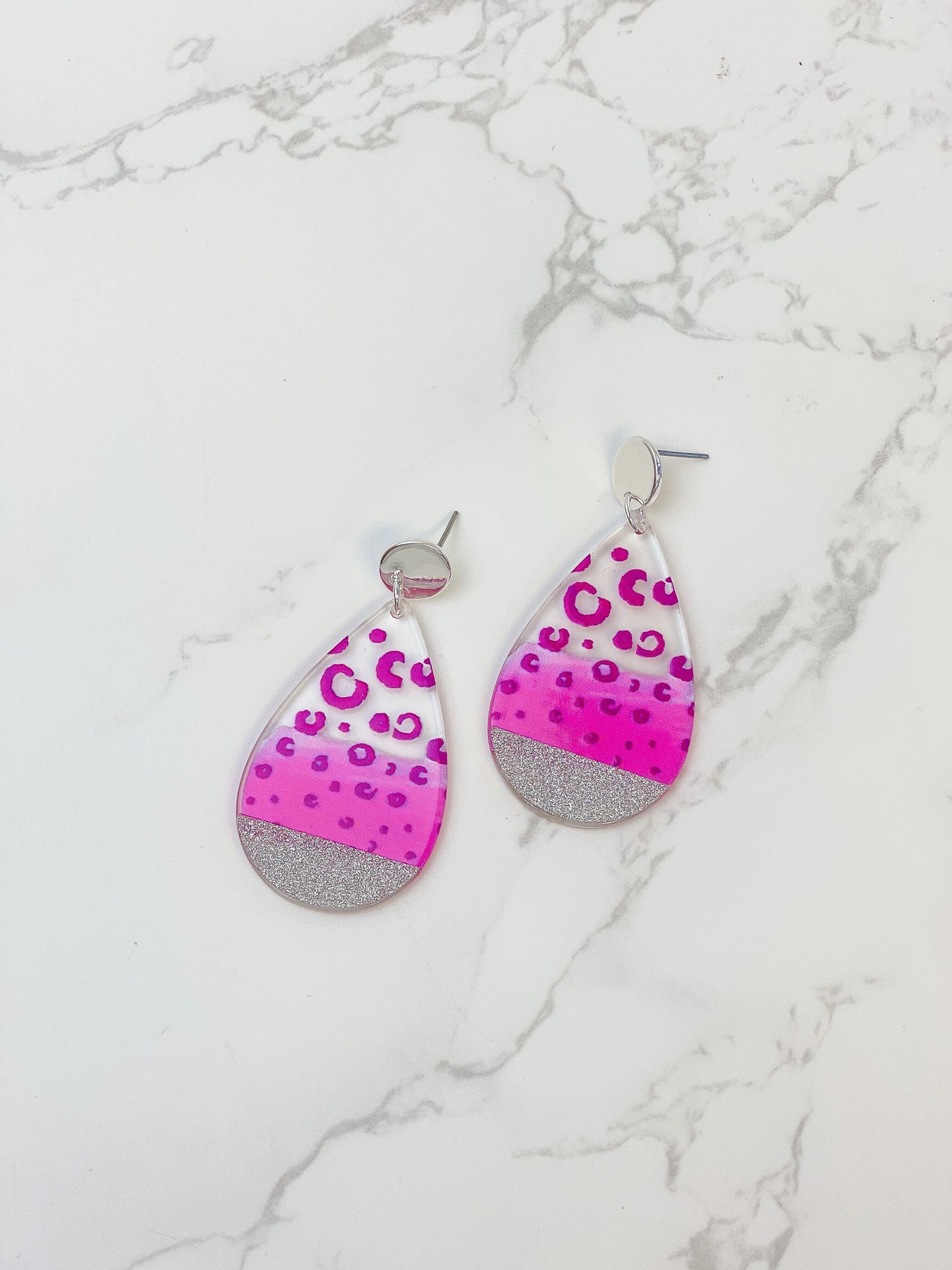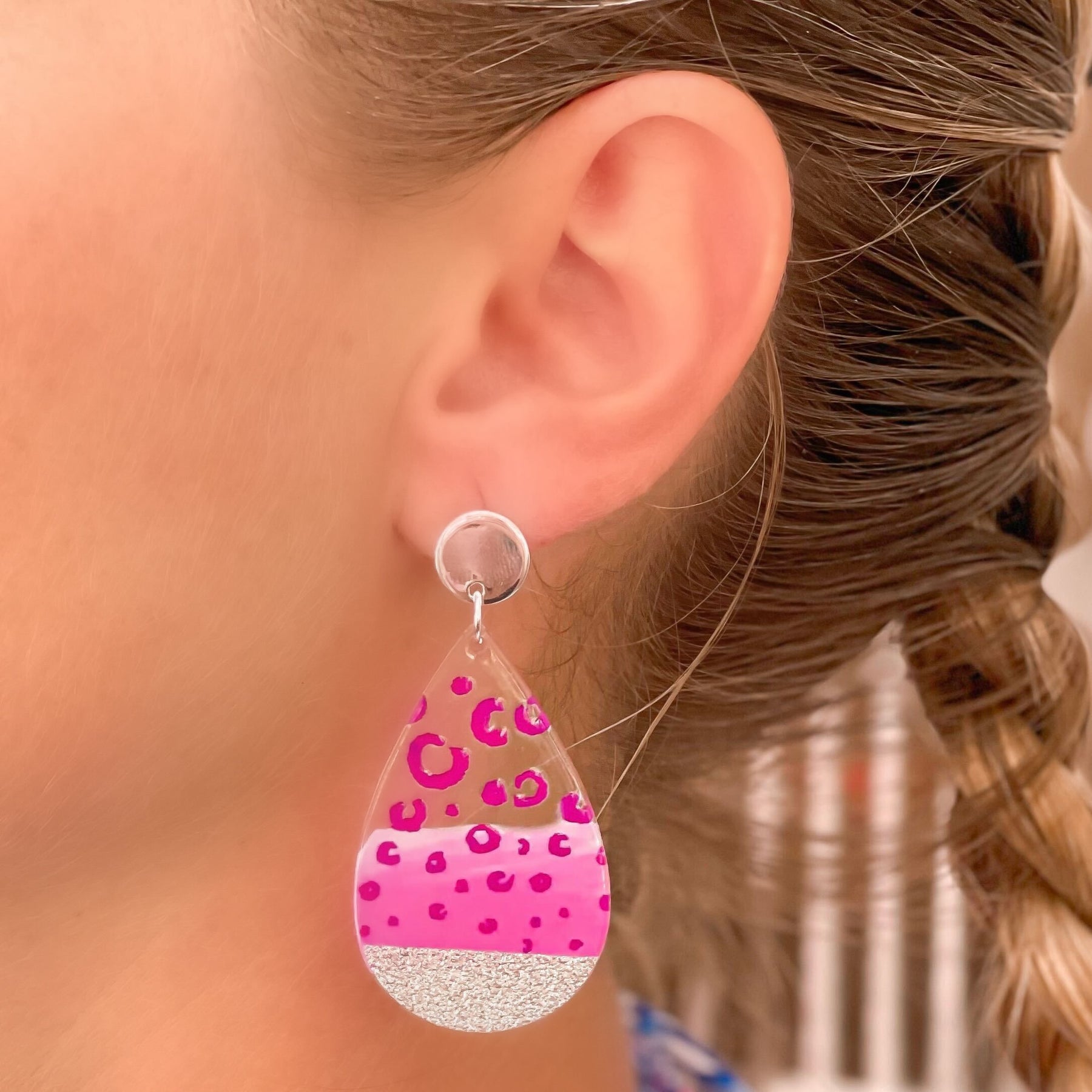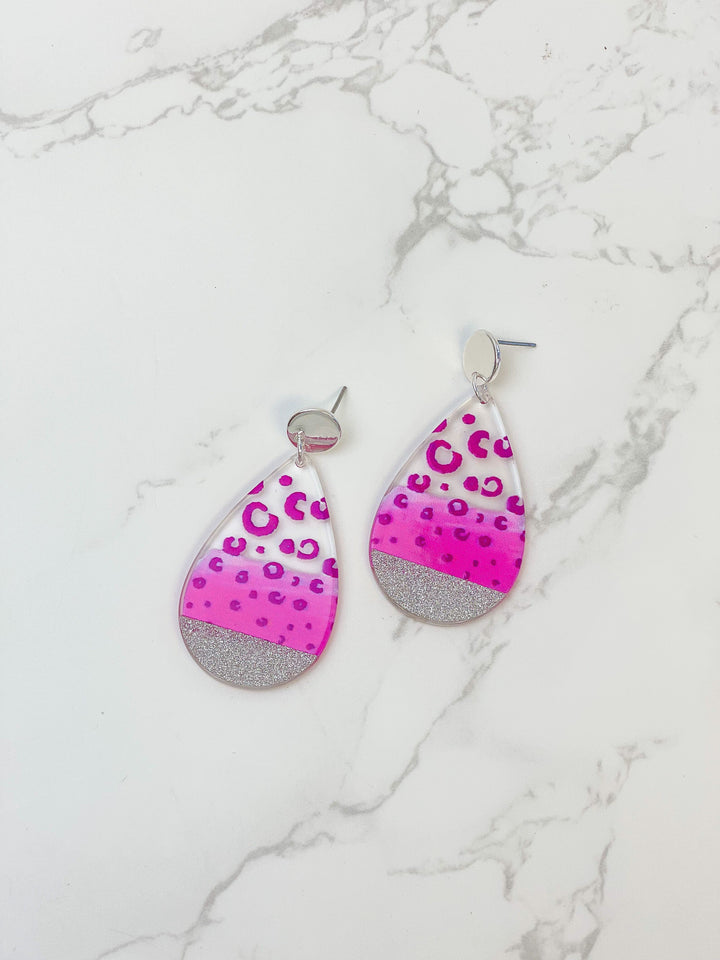 Cheetah Painted Clear Glitter Dangle Earrings - Fuchsia