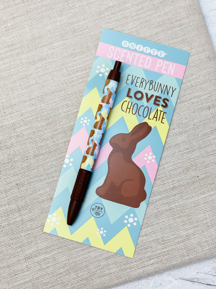 Everybunny loves CHOCOLATE! Our yummy chocolate scented pen makes the perfect addition to Easter baskets! Scented grip and tip, individually wrapped pen on beautifully decorated card with scent sample hole. Fun facts on the back!