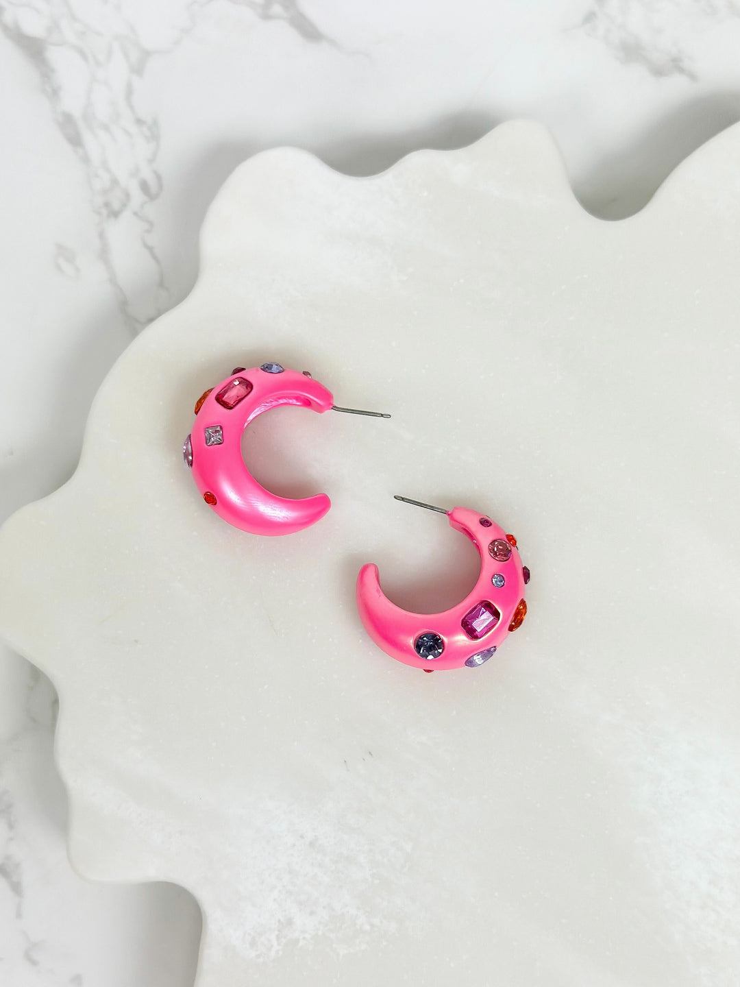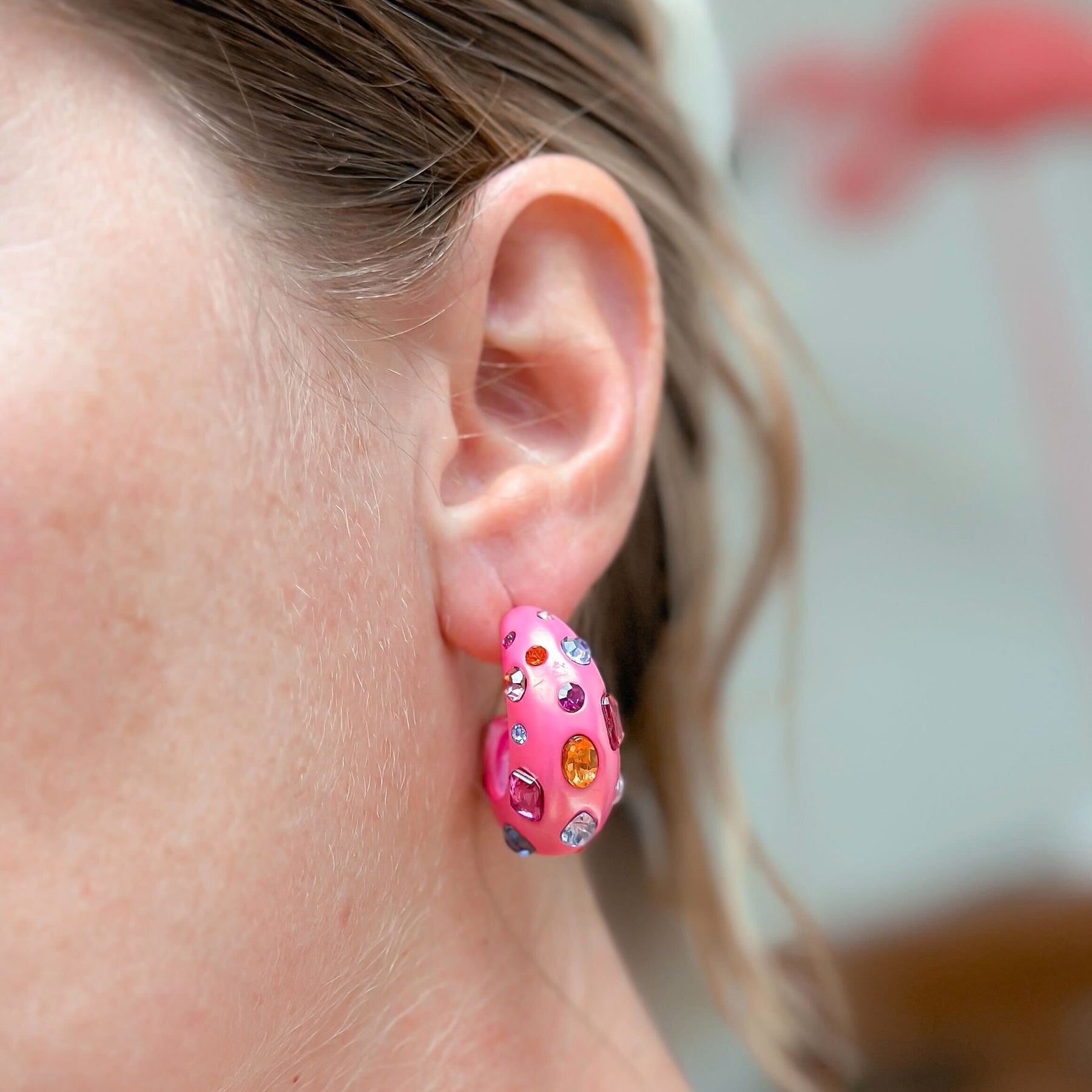 Chunky Rhinestone Bauble Hoop Earrings - Pink