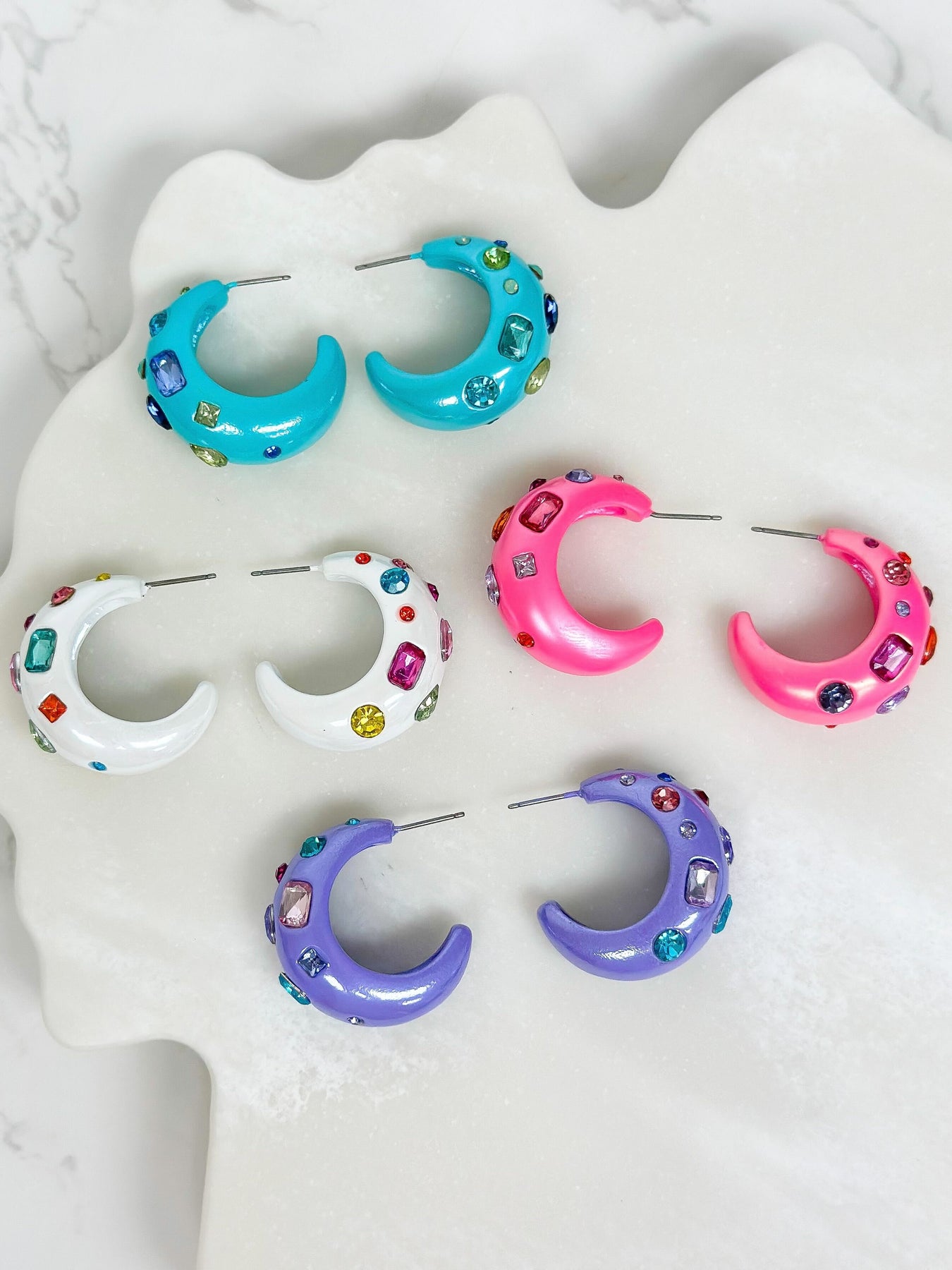 Add a pop of color to your summer wardrobe with these Chunky Rhinestone Bauble Hoop Earrings. The vibrant hue is perfect for bringing a fun and playful touch to any outfit. The chunky hoops add a bold statement, while the rhinestones provide a touch of sparkle. Perfect for adding some summer vibes to your look.