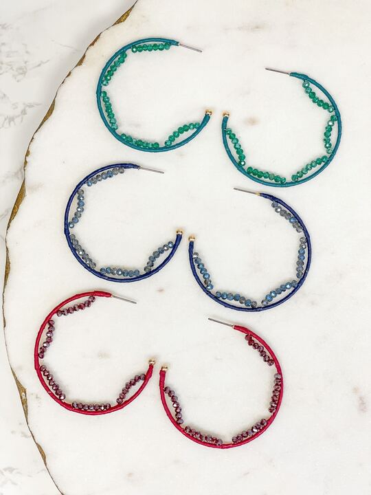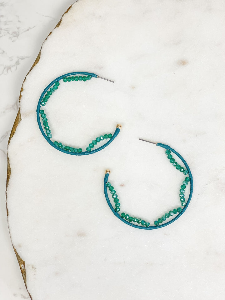 Crystal Beaded Trimmed Hoop Earrings - Teal