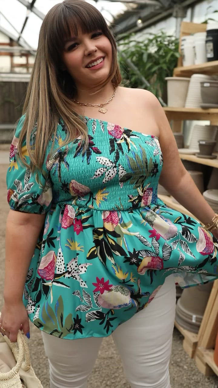 Say goodbye to your basic summer tops with the Day Trip Blouse! An adorable one-shoulder silhouette falls into a shirred bust, and peplum-style bodice, with a puff sleeve, elasticated at the cuff. Style this bold top with white skinnies, sunnies, nude sandals, and bright accessories for a fun resort-inspired look!