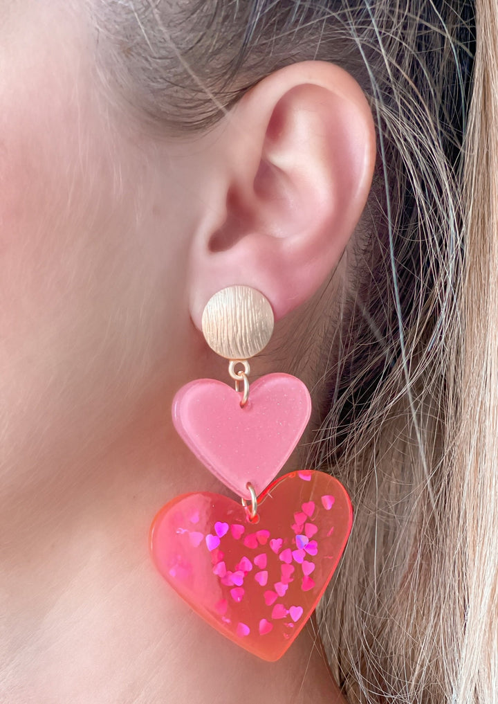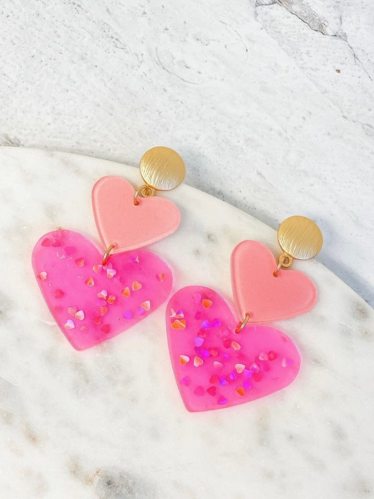Double Heart Confetti Heart Dangle Earrings - Neon Pink