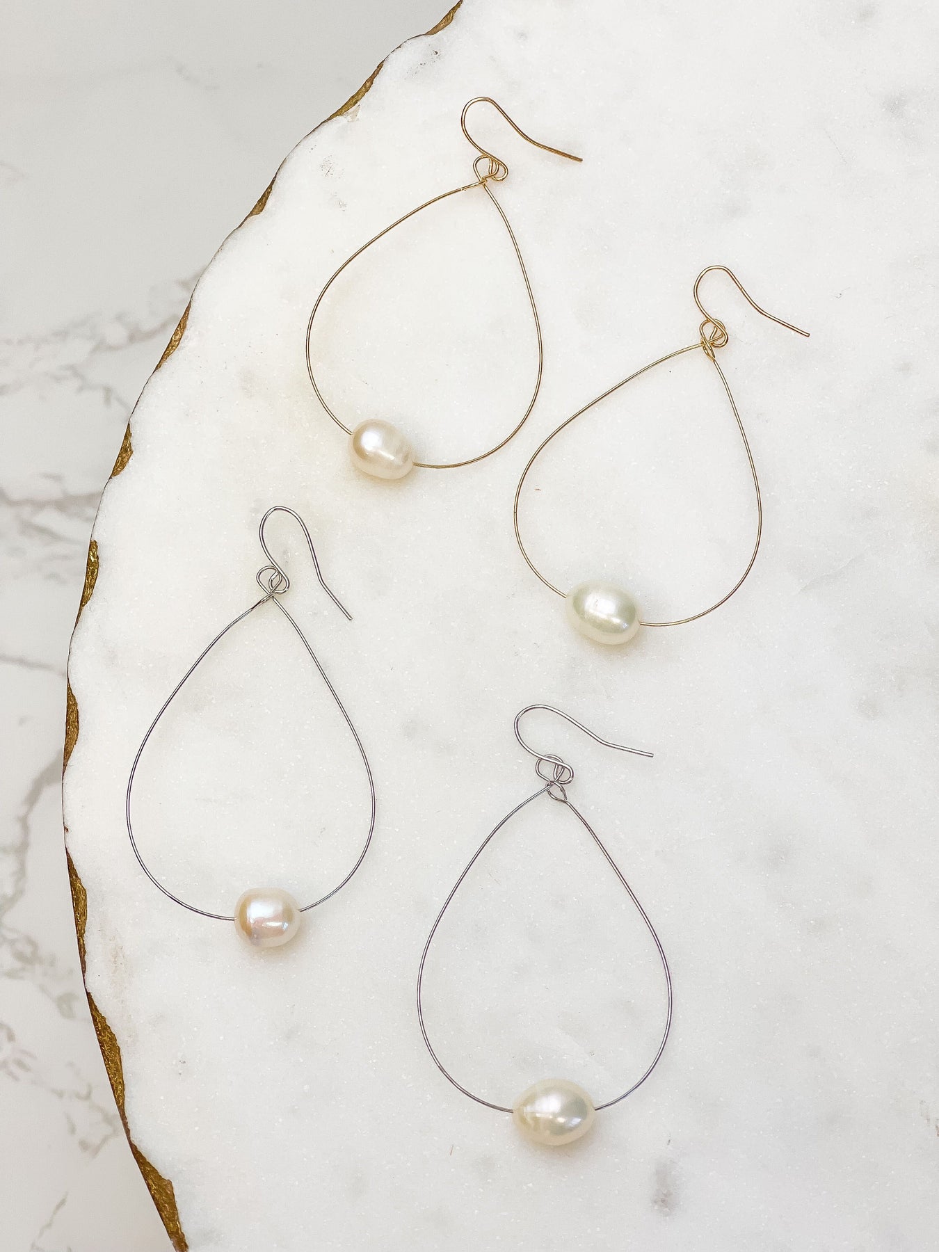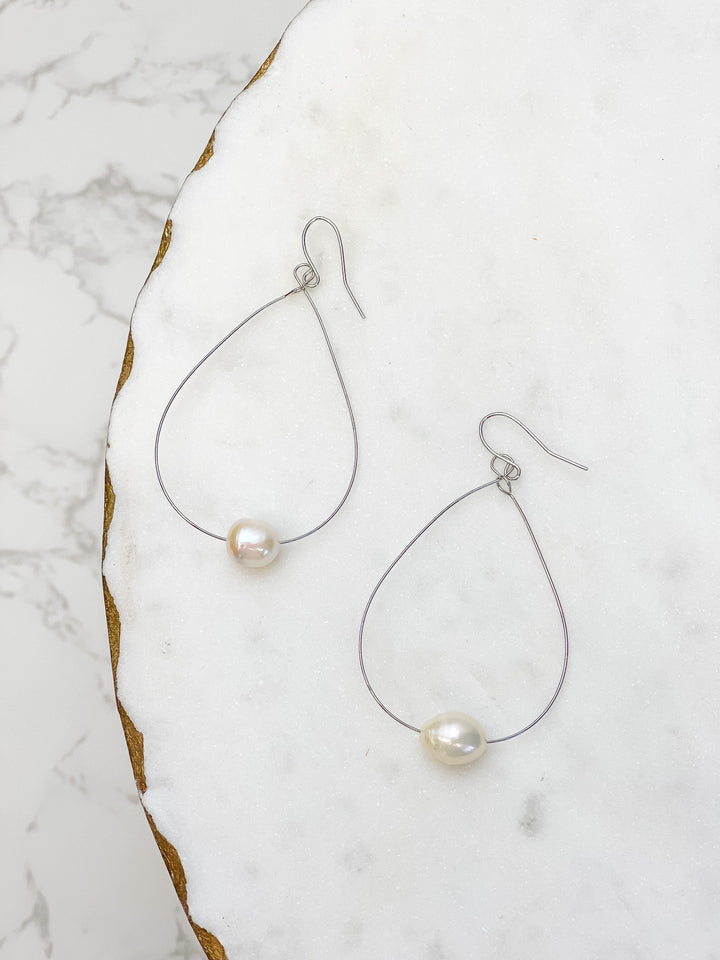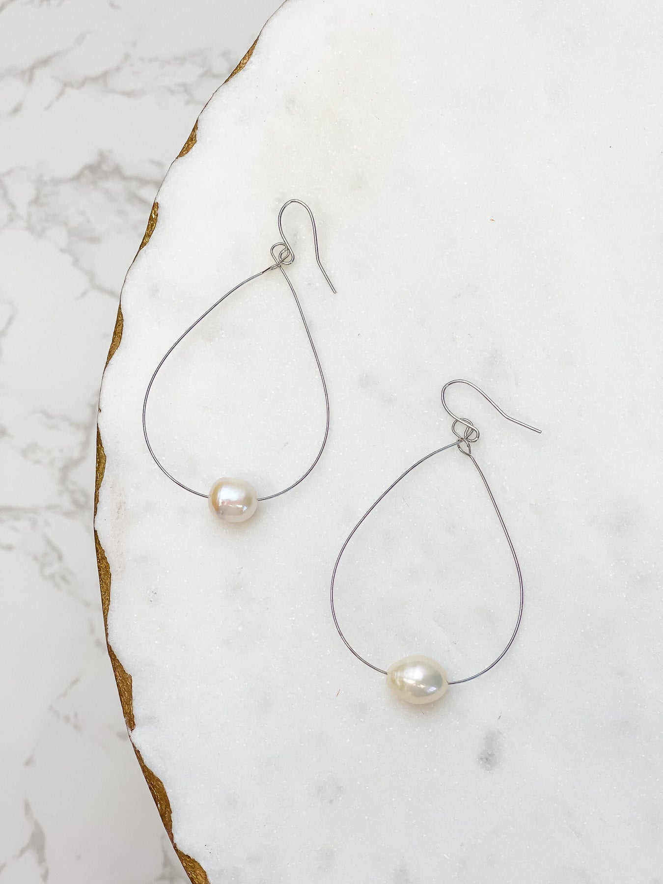 Freshwater Pearl Minimalist Oval Earrings - Silver