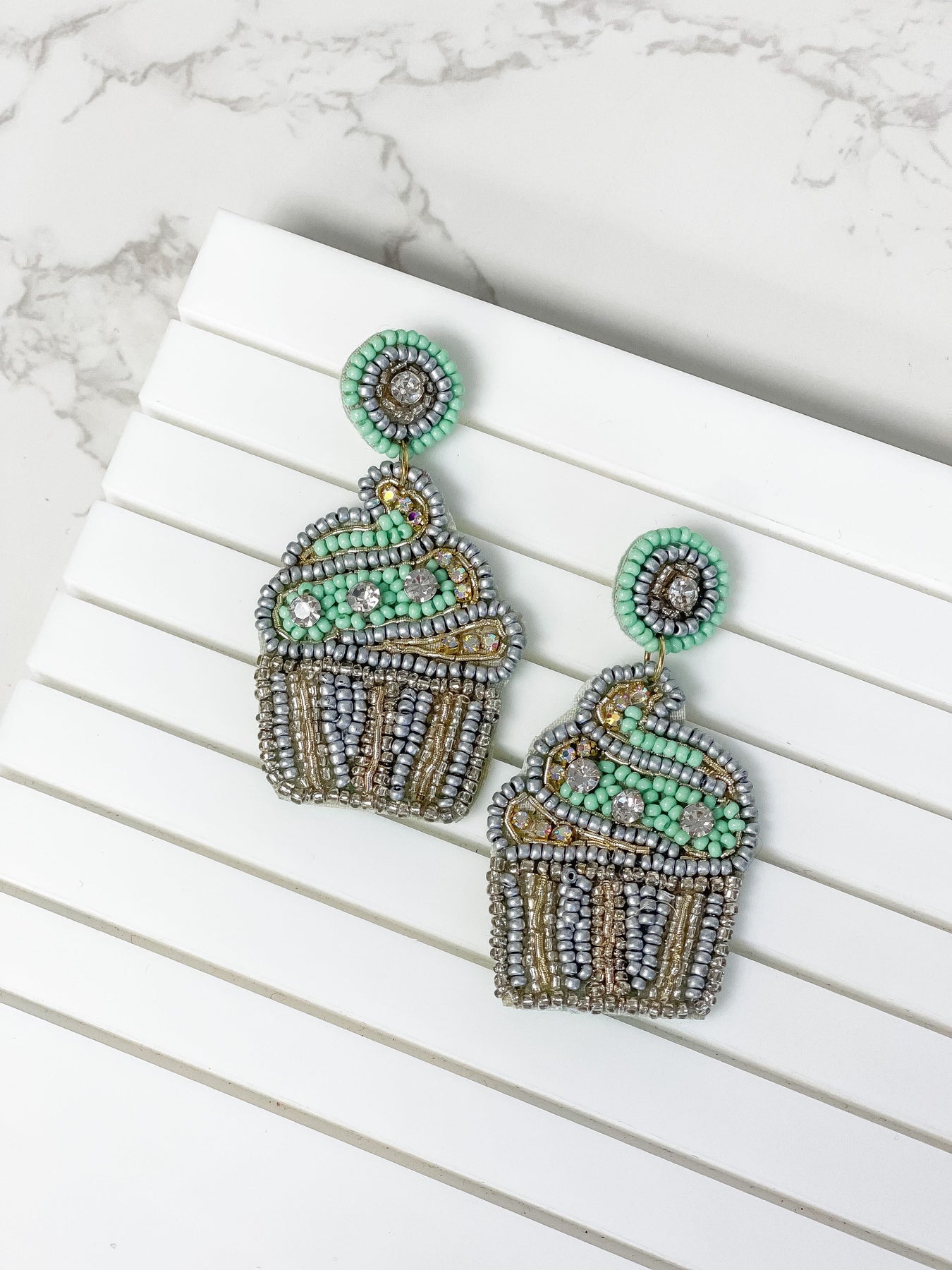 Glitzy Cupcake Beaded Dangle Earrings - Mint