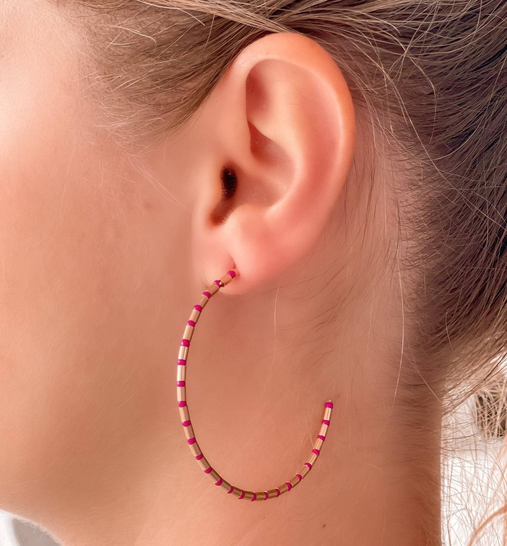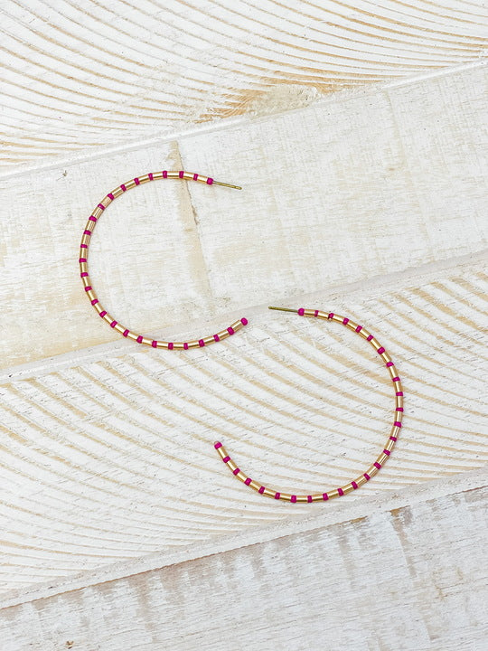 Gold Beaded Skinny Hoop Earrings - Fuchsia