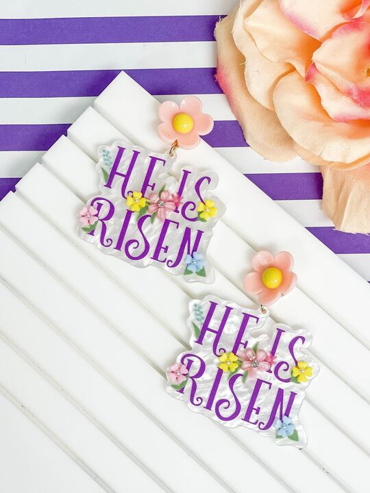 Celebrate Easter with these stunning 'He Is Risen' Acrylic Dangle Earrings. The perfect accessory to add a touch of faith-based elegance to your outfit.