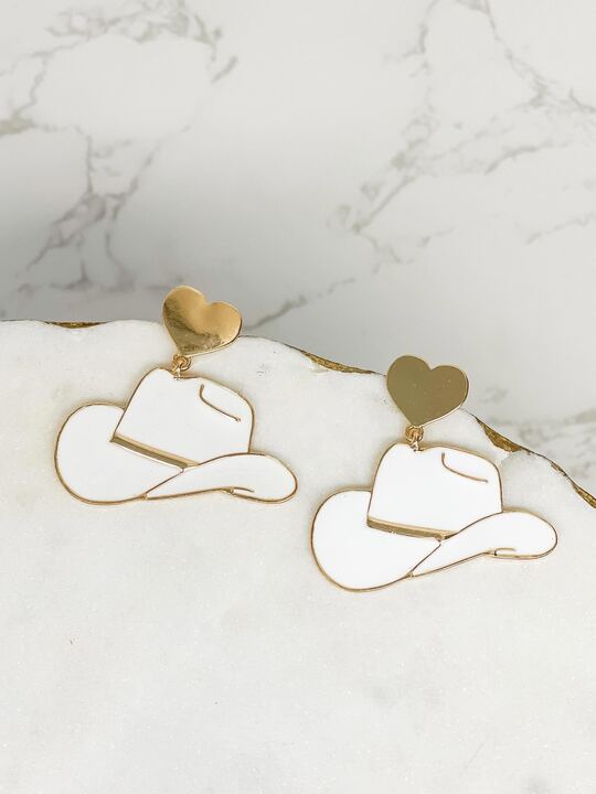 Heart Cowboy Hat Enamel Dangle Earrings - White
