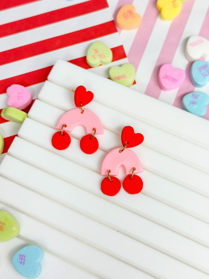 These Heart Dangle Arch Earrings feature a beautiful bright red heart dangle, sure to bring a pop of color to any outfit.