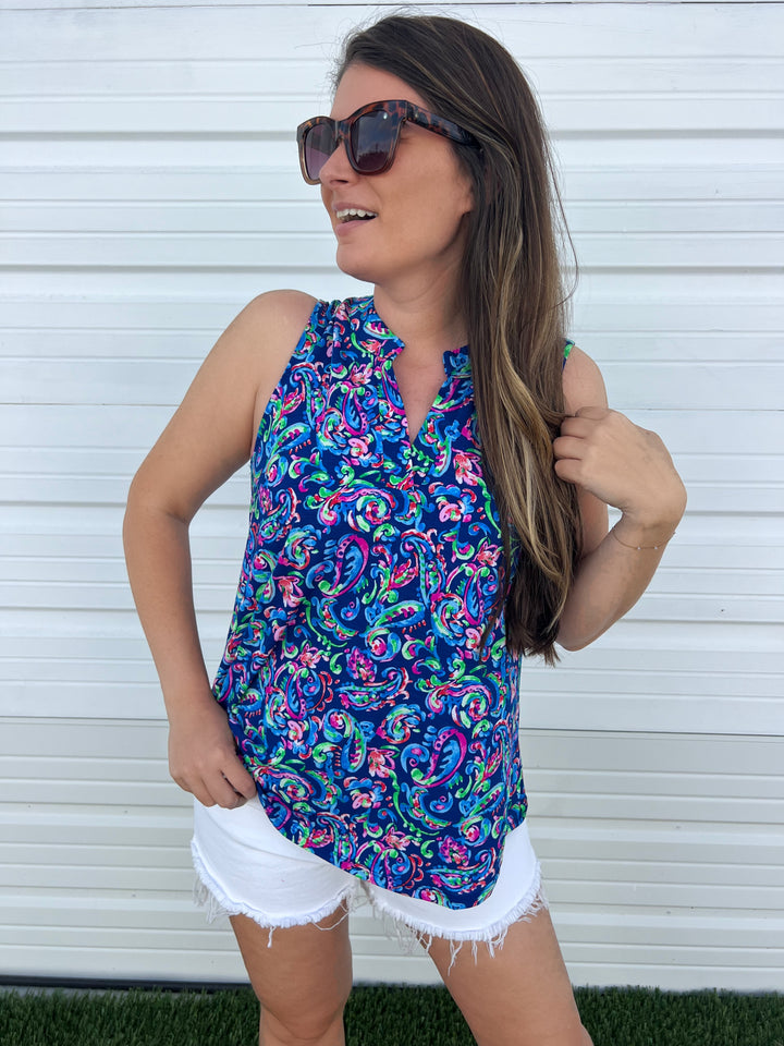 Add a touch of luxury to your wardrobe with the Lizzy Tank Top. Made with Bulgari fabric, this tank top features a flattering V-neck and a stylish tank top silhouette. Perfect for adding a pop of playful pattern to any outfit.
