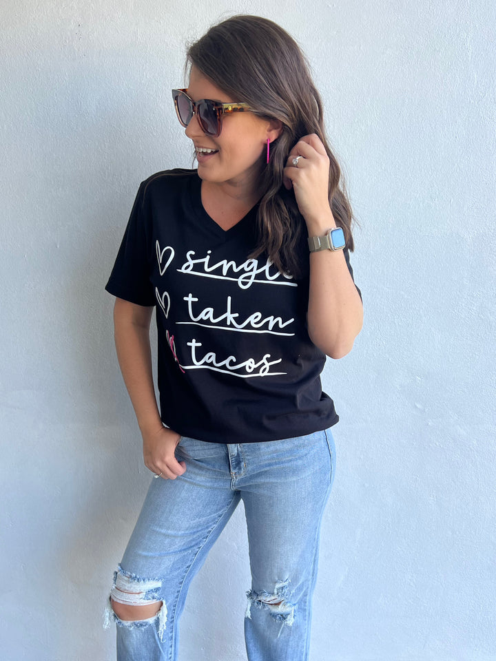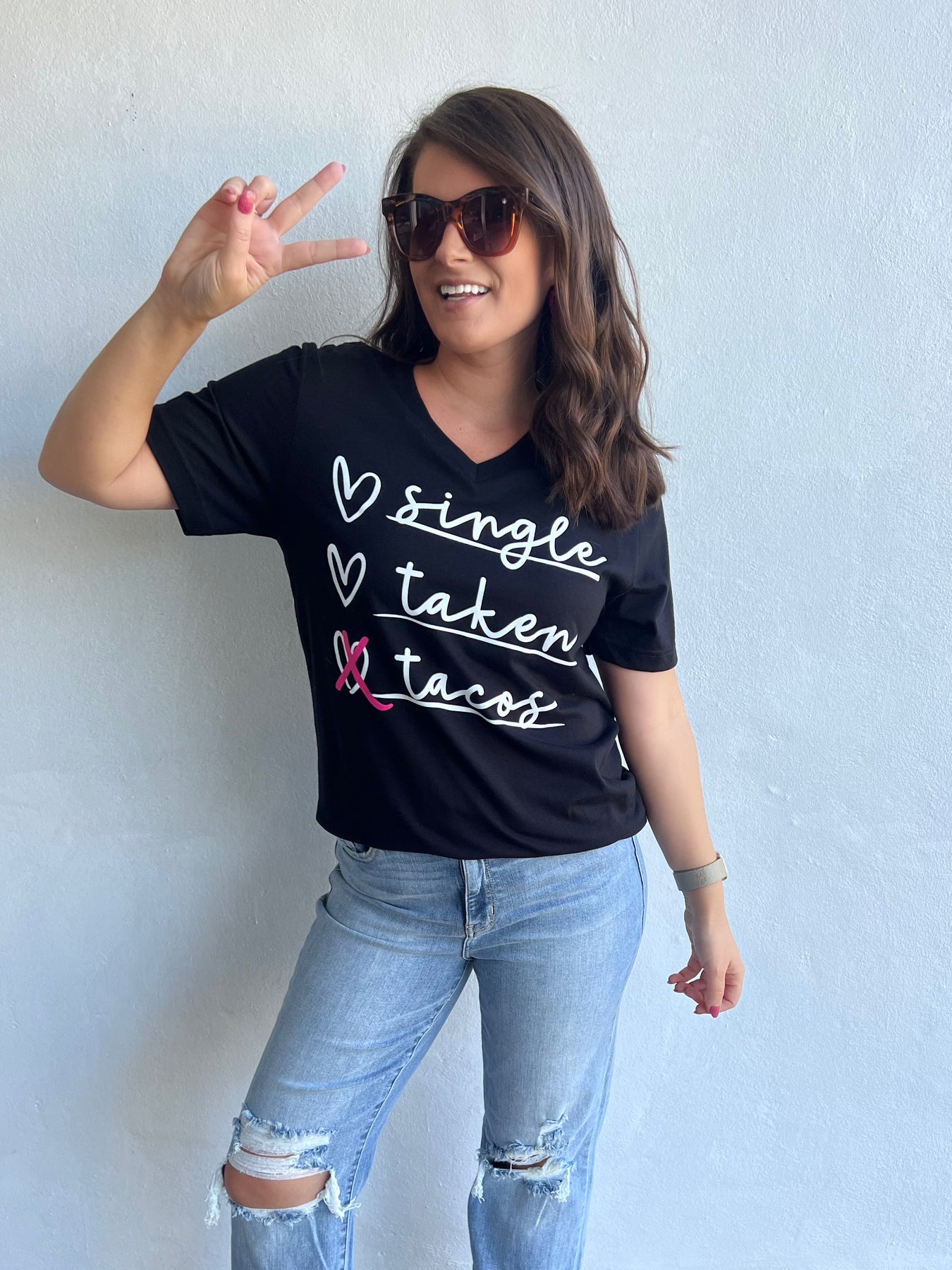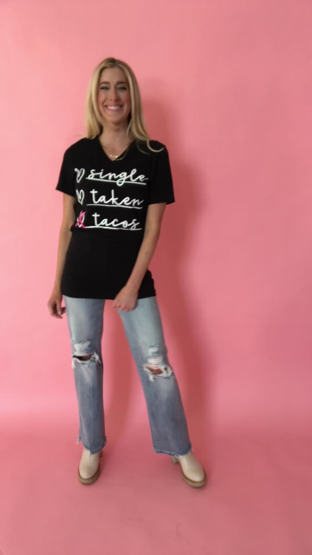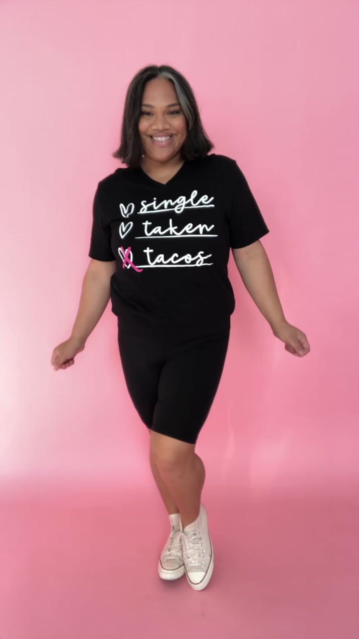 Whatever your plans are on Valentine's Day, let it involve tacos! The Love & Tacos tee features a lightweight jersey fabric that shapes a v-neckline with short sleeves and a slim fit bodice.