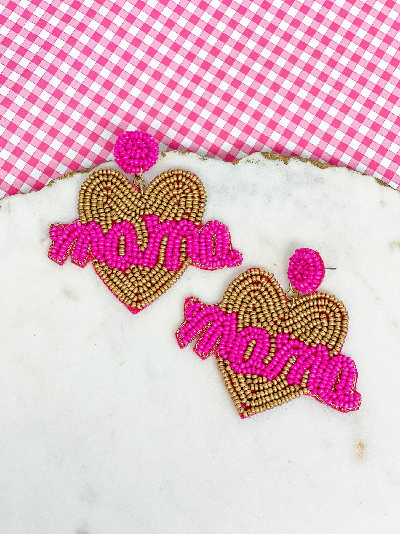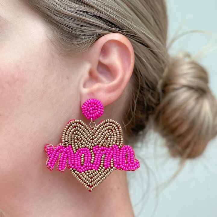 Mama Heart Beaded Dangle Earrings - Pink