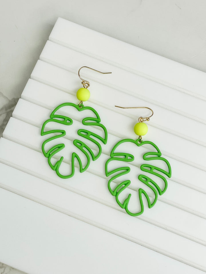 Monstera Color-Coated Outline Dangle Earrings - Green