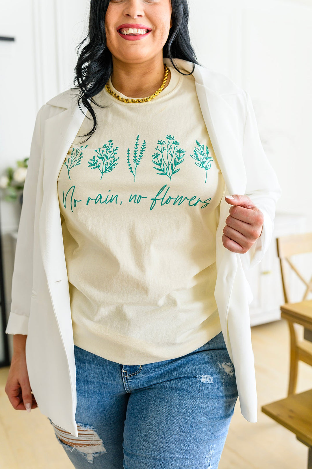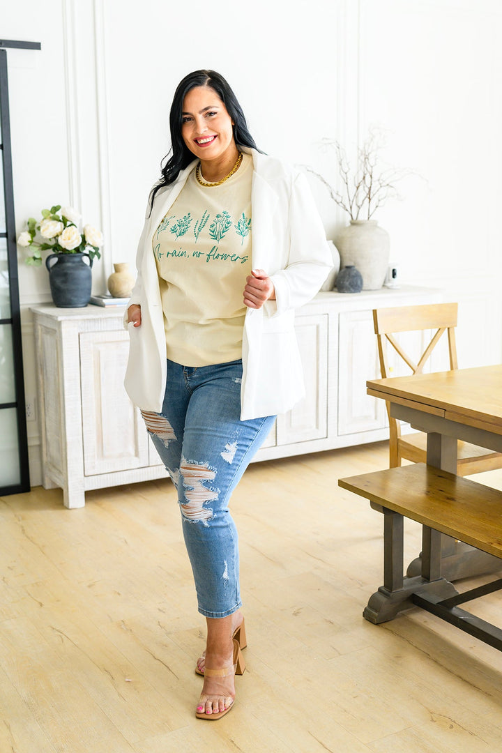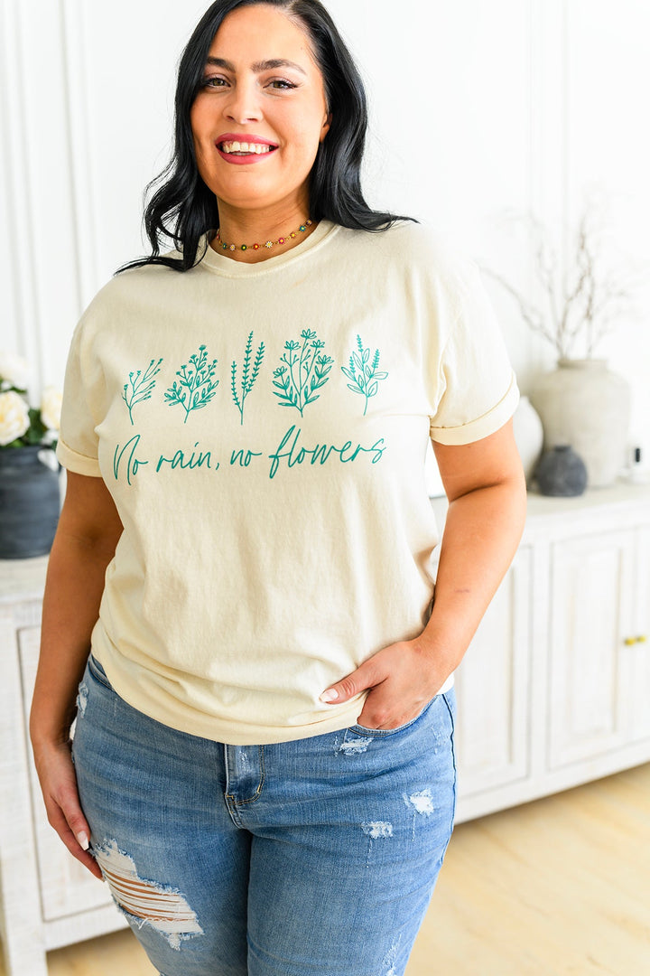 Be ready for the rain and look forward to the flowers with the beautiful No Rain No Flowers graphic tee. This soft cotton tee features a teal floral graphic, it's perfect for cozy days indoors or brightening gloomy days outdoors. Feel vibrant and stylish in this easy silhouette-- a wardrobe must-have!