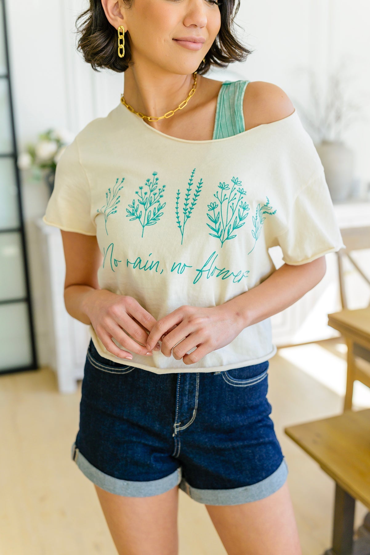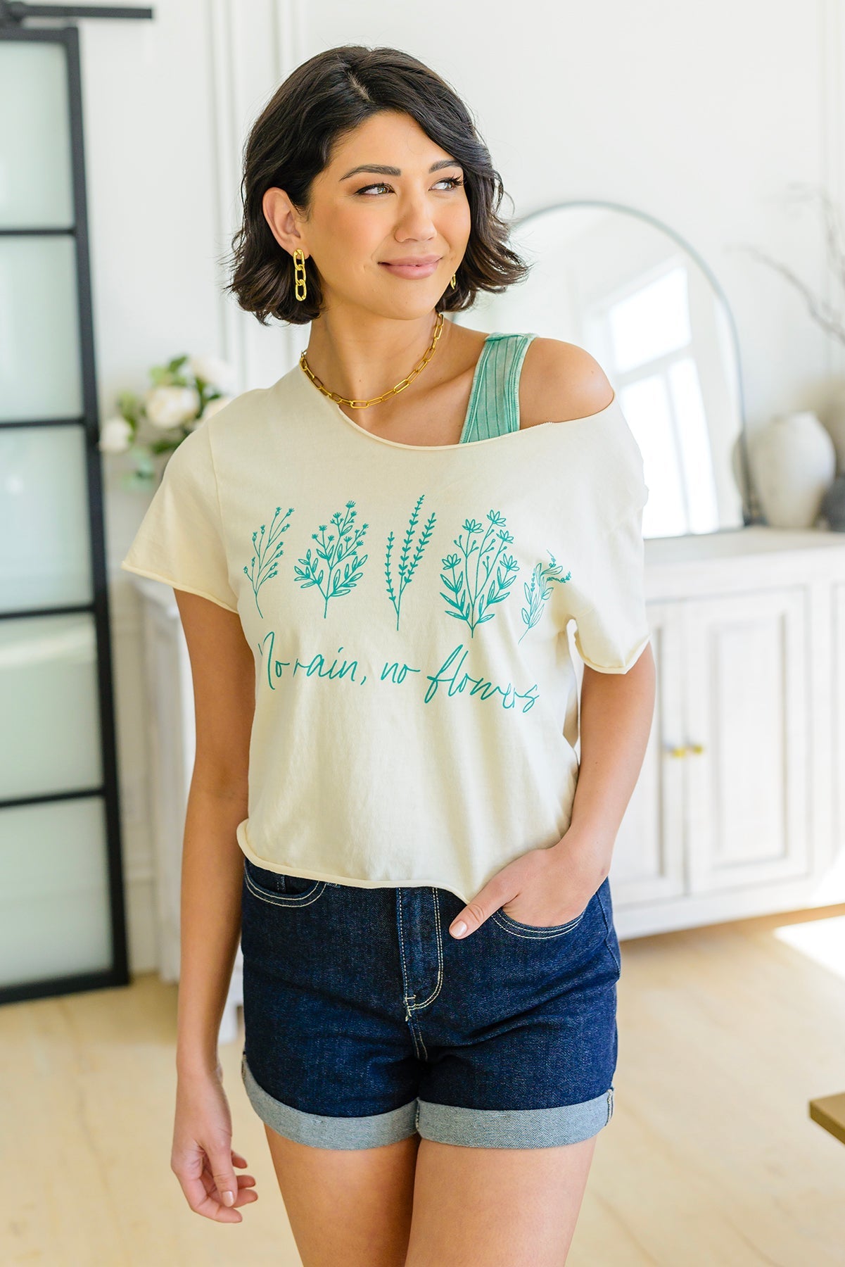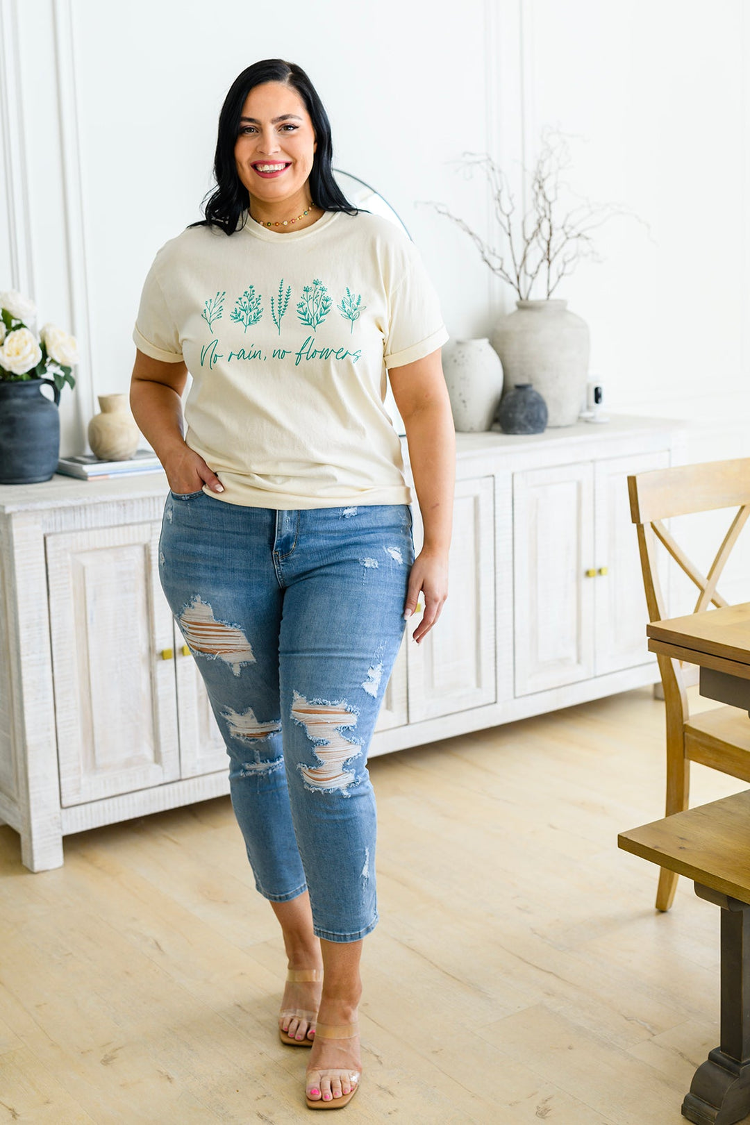 Be ready for the rain and look forward to the flowers with the beautiful No Rain No Flowers graphic tee. This soft cotton tee features a teal floral graphic, it's perfect for cozy days indoors or brightening gloomy days outdoors. Feel vibrant and stylish in this easy silhouette-- a wardrobe must-have!