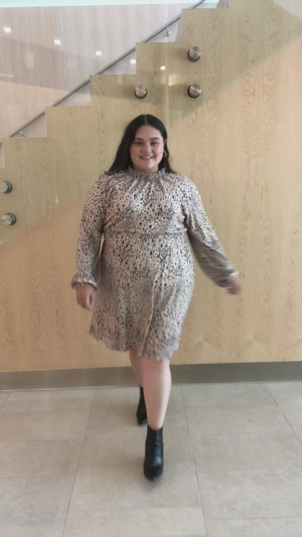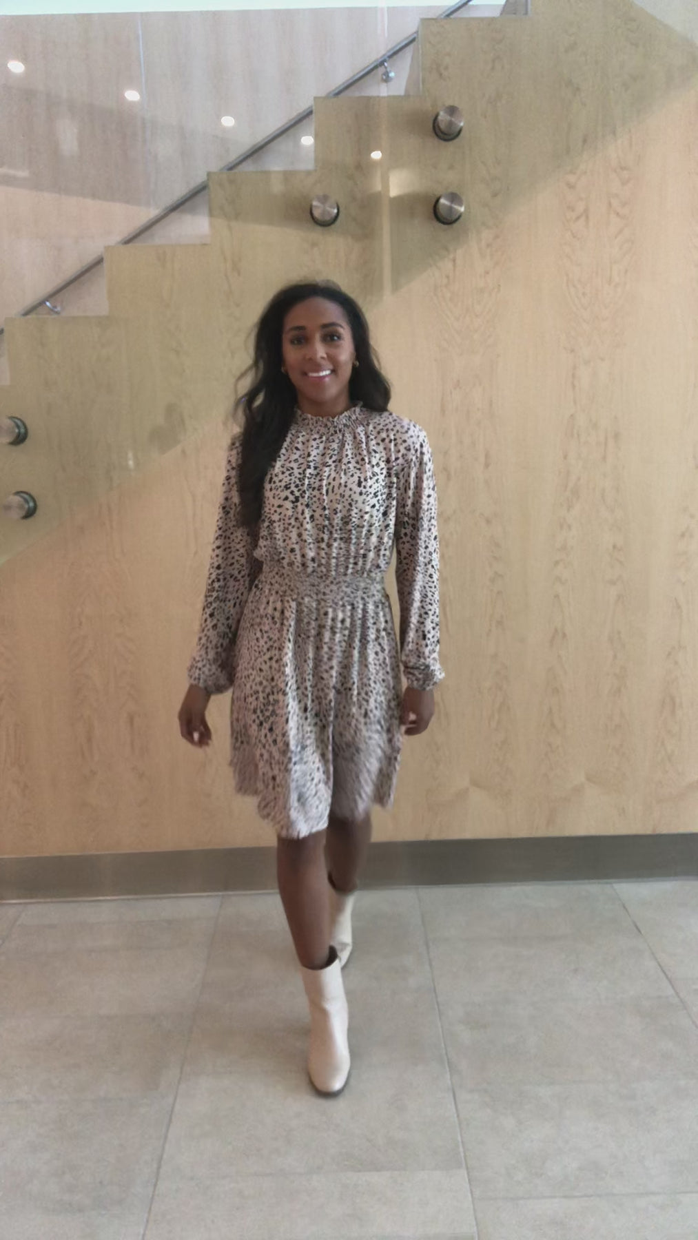 The Ophelia Animal Print Shirred Waist Dress is perfect for any event life throws at ya! Whether it's dinner, girls night out, or a work party this dress has what it takes to make the cut. Featuring a round neckline that tops a slightly loose fit bodice, and a shirred waistline. A flowy knee-length skirt and long sleeves with elastic cuffs make up the rest of this adorable dress. Pair with heels and a matching bag for a fail proof look!