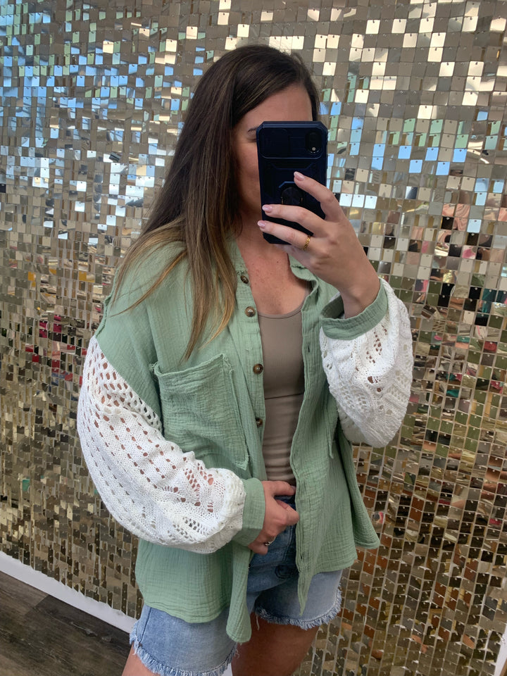 Crochet Sleeve Shacket by POL - Pistachio Sage
