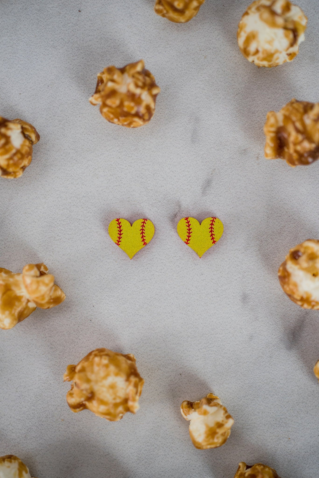 Hand drawn, laser cut and engraved yellow & red softball heart acrylic studs. Great for sensitive ears!