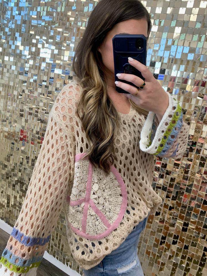Striped Sleeve Loose Knit Peace Sign Top by POL