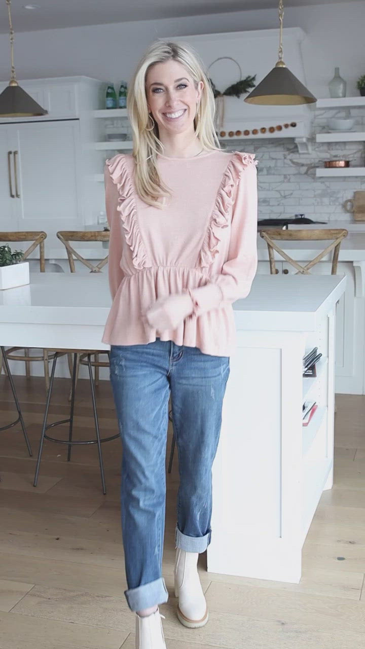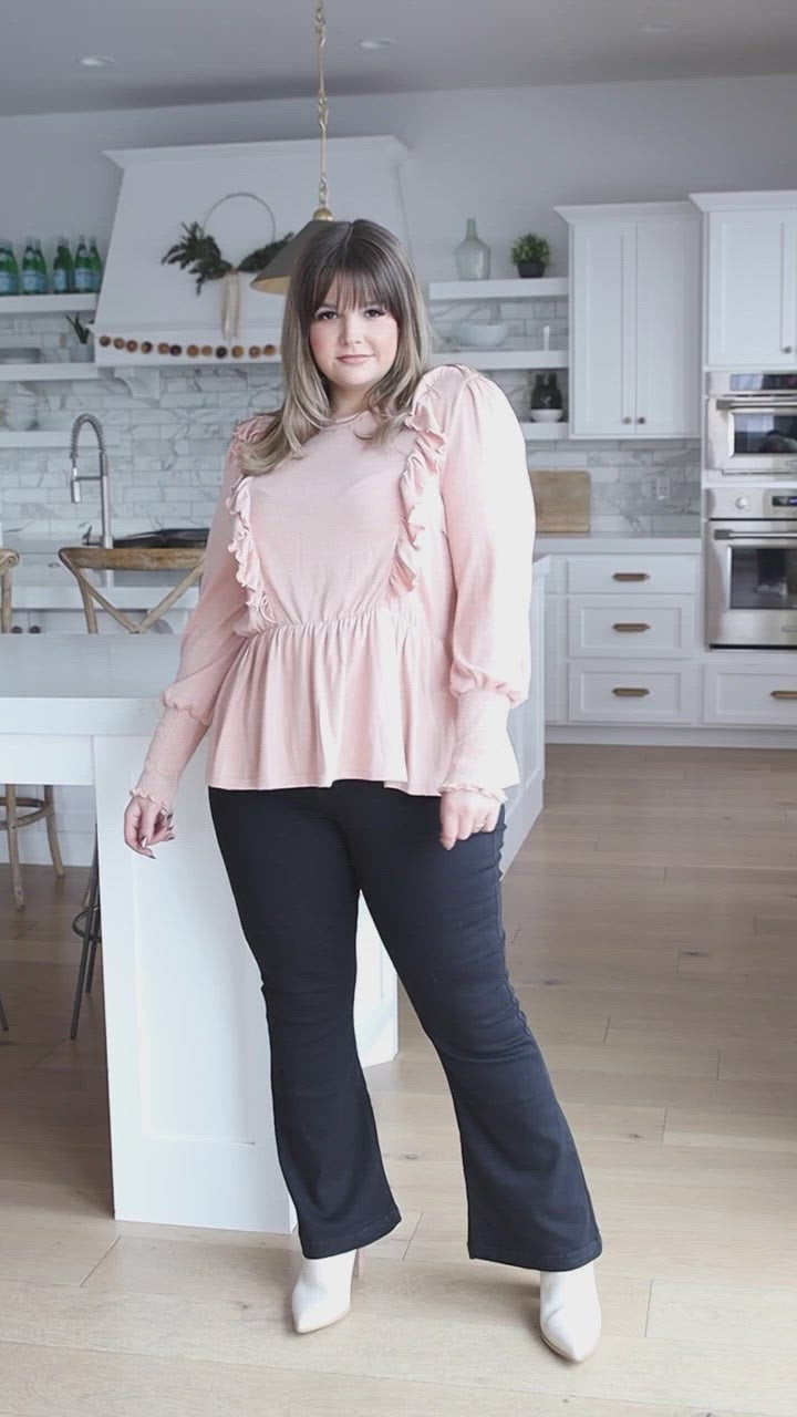 The picture of femininity, this long sleeve ruffle front blouse is made of soft, lightweight fabric with the a comfortable stretch. Finished with ruched cuffs and a peplum waist, this long sleeve blouse adds a fun style to dressy and casual outfits!