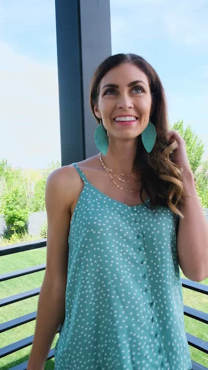 A trend that will never go out of style! Polka dots are truly here to stay, and the Top Floor Tank is the perfect pick for your closet! In a stunning sage green decorated in tiny white polka dots that shapes a v-neckline, button front, and a flowy silhouette. Perfect for those hot summer days!