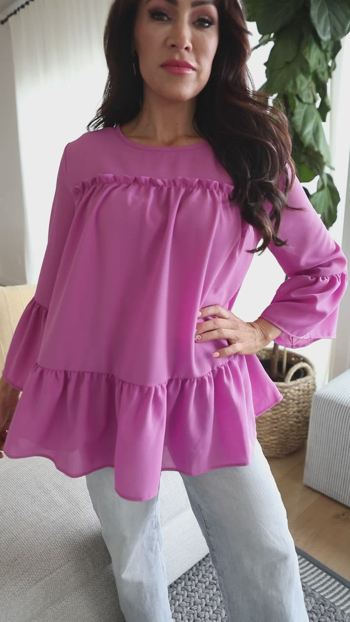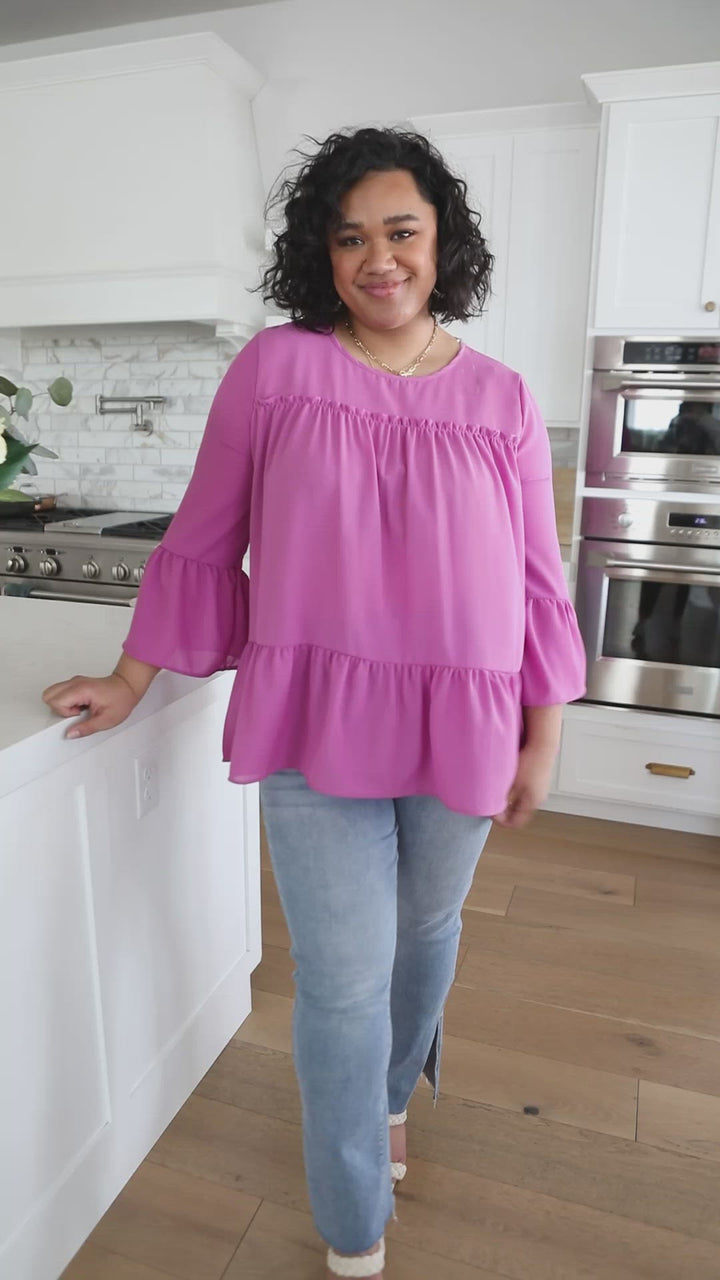 Be ready to wow em' in the Valley Girl Blouse! A woven polyester shapes a peplum style bodice, with bell sleeves, and a-line silhouette. This is the perfect top to pair with white jeans and nude sandals, for a complete summer look!